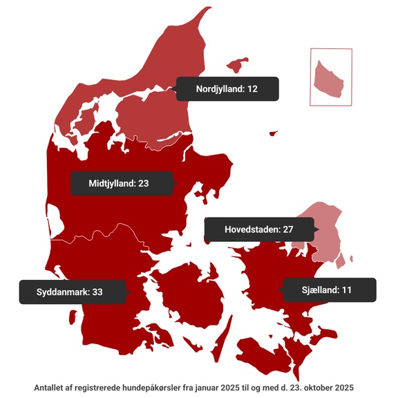 Tal fra Dyrenes Beskyttelses Vagtcentral 1812 viser, at der i 2025 allerede har været 106 hundepåkørsler over hele landet, men at særligt tre regioner skiller sig ud. Region Syddanmark og Region Hovedstaden topper statistikken med henholdsvis 33 og 27 sager, mens Region Midtjylland også har et bemærkelsesværdigt antal hændelser på 23.