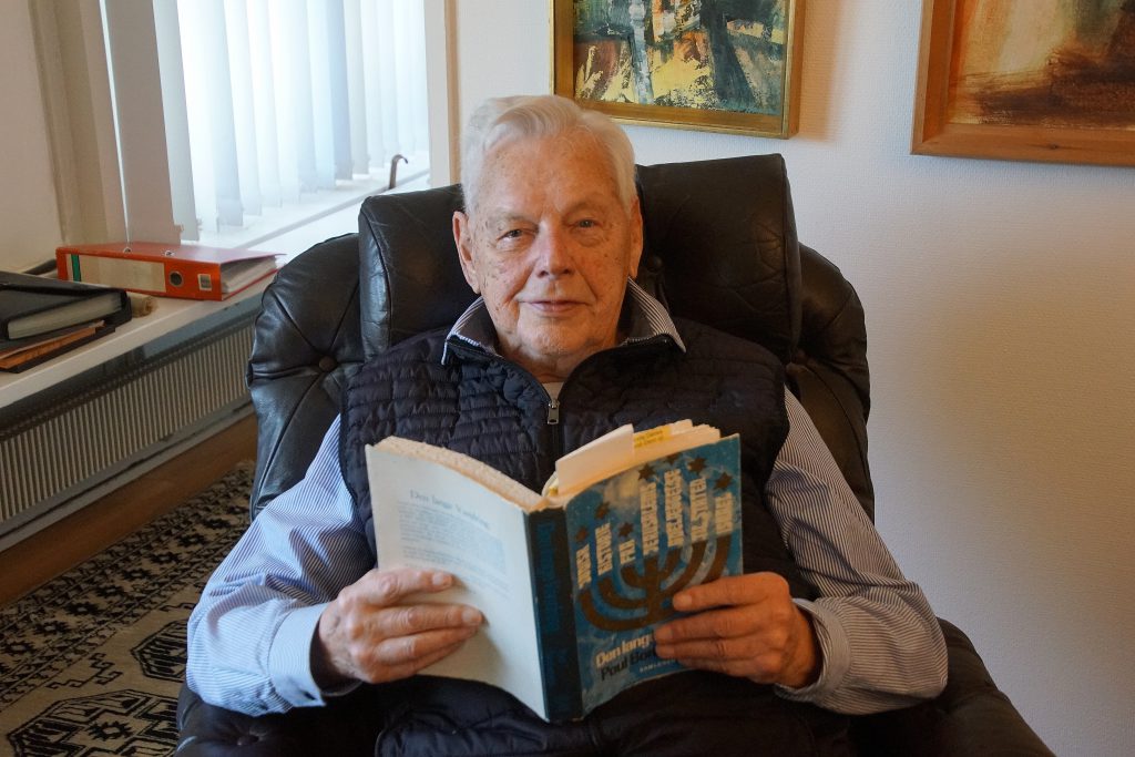 Han har gået meget i kirke, men det sker ikke så ofte mere. Det kniber lidt med bentøjet. I stedet ser han morgenandagten hver morgen, og læser herefter avisen.