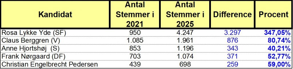 Det svarer til en fremgang på hele 347,1 %. Hun stillede også op til valget i 2017, og kigger man på fremgangen fra 2017 til 2025, er det en fremgang på 4081 stemmer, svarende til en stigning på svimlende 2458,43 %.