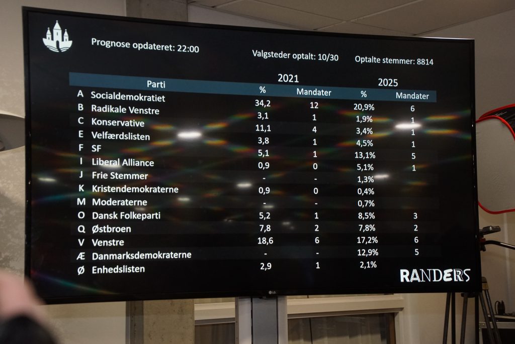 Ifølge den første prognose står Socialdemokratiet til at blive halveret. Ved valget i 2021 fik partiet 12 mandater, og i aften til at få 6 mandater.