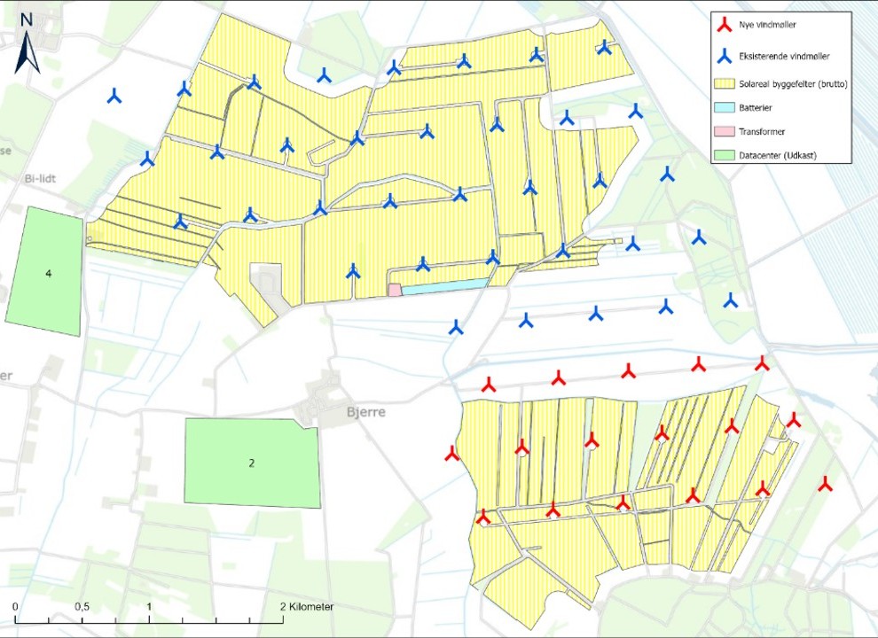 Beskrivelse af ansøgning om solcellepark ved Overgaard: Solcelleparken består af to adskilte områder på til sammen op til 850 hektar. Solcelleparken opdeles af beplantning i felter af ca. 50 ha. Arealet forventes reduceret på grund af fuglelivet i området. Da dette ikke er afklaret, vises de oprindelige arealer her på kortene. Solcelleparken forventes etableret med bevægelige solcellepaneler, de såkaldte trackere, eller på faste stativer. Solcellepanelerne monteres i parallelle rækker. Solcellepaneler vil maksimalt blive 4 meter høje. Solcelleparken vil mindst have en afstand på 1,1 km til Udbyneder, 500 meter til Bjerre og 1,2 km til Sødring. De fleste læhegn bibeholdes og omkring solcelleparken vil der blive etableret ny beplantning, som i løbet af en kortere årrække vil opnå samme højde som panelerne og skjule anlæggene fra omkringliggende veje, beboelser mm. Solcelleparken forventes ikke hegnet med trådhegn. |